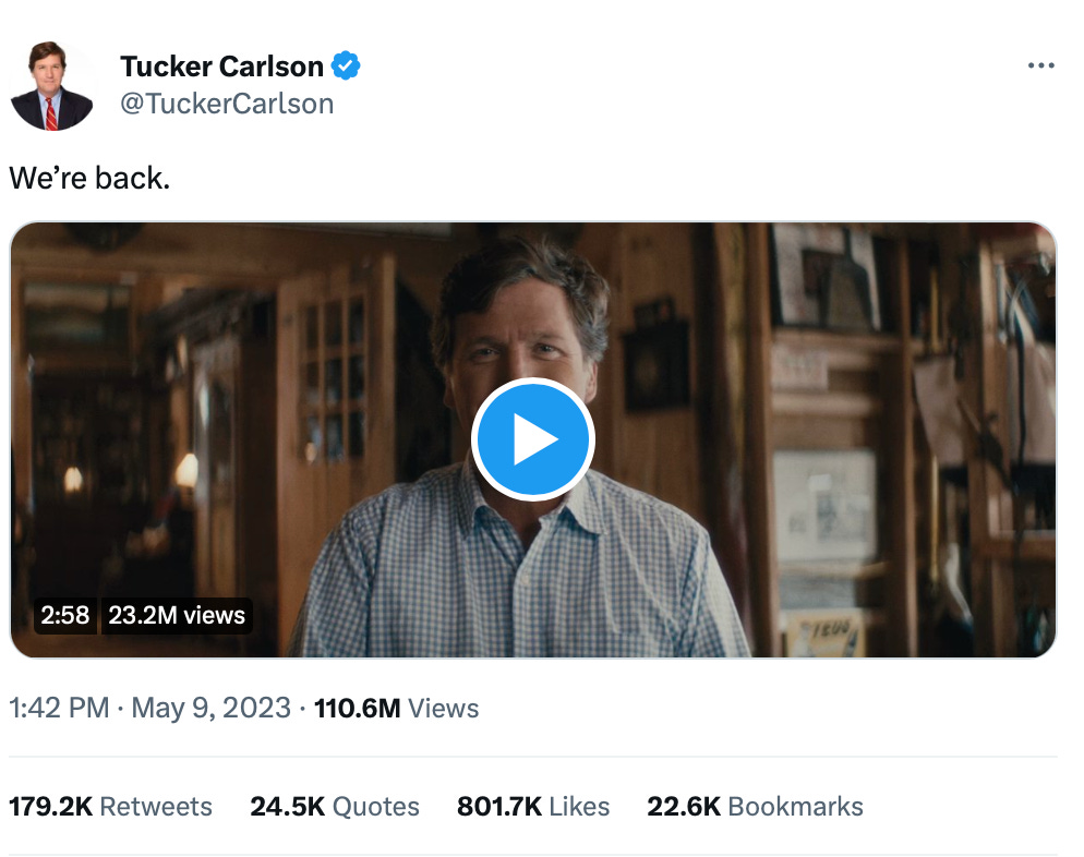 One reason so many tuned into Carlson, as opposed to reading Substack, is the human face. We want to see people telling us things as opposed to reading words on a screen. That is what drives the popularity of Tik Tok now. No need for memes or emojis if you have the OG. That’s what I love about this deal - Tucker is making Twitter a more multi-media experience, and that’s a good adaptation for the app. And for us.