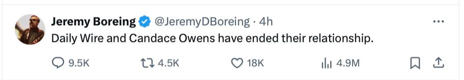 Candace Owens wanted out, and the Daily Wire probably wanted her gone. It was a mutual decision, yet almost everyone's “take” is that she was “canceled” for her anti-Israel opinion. That is not the case. They could have fired her, but they did not. They gave her the choice. She chose to leave.