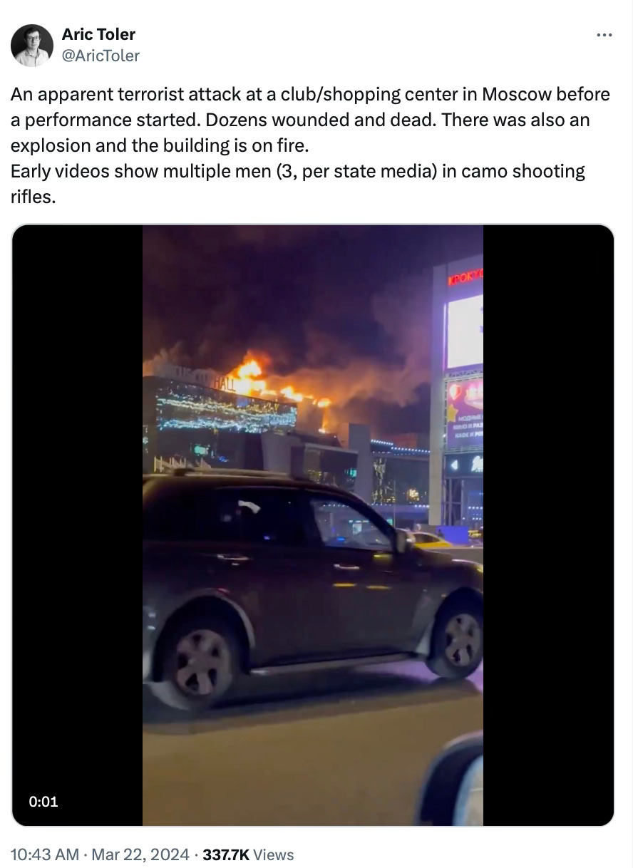The attack took place as crowds gathered for a concert of Picnic, a famed Russian rock band, at the hall that can accommodate over 6,000 people. Russian news reports said that visitors were being evacuated, but some said that an unspecified number of people could have been trapped by the blaze. Breaking news.
