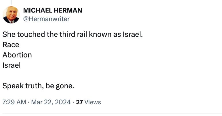 Here is where I land on a third rail, as told to me by Michael Herman, who writes his own Substack. He is, like many here in the comments, on the anti-Israel side of the war in Gaza. He isn’t the first person to suggest that Candace Owens crossed the EVIL BAD PRO-ISRAEL BEN SHAPIRO (he didn’t say it that way but that’s sort of the idea floating around X).