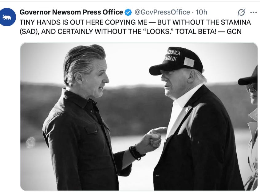 I’m writing a different piece about the Democrats and how Trump has made fools of them all, but just to say, it didn’t take Trump long to make a fool of Gavin Newsom. All he had to do was remove the all-caps.