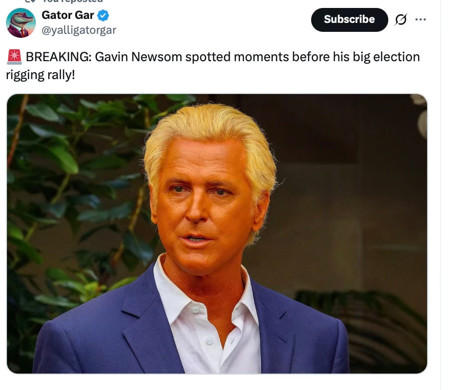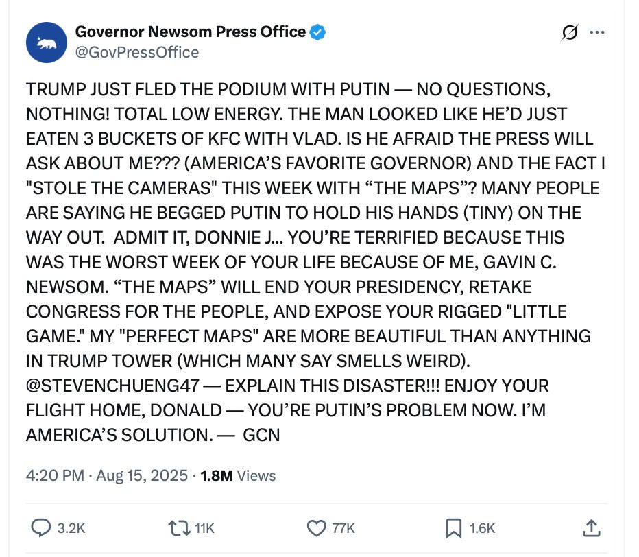I doubt Gavin wrote this himself. Either he’s hired some dumb septum-pierced coddled Gen-Z staffer to write it, or else, as someone suggested on X, ask Grok to write it. Either way, it’s posted by his press office and meant to be funny.