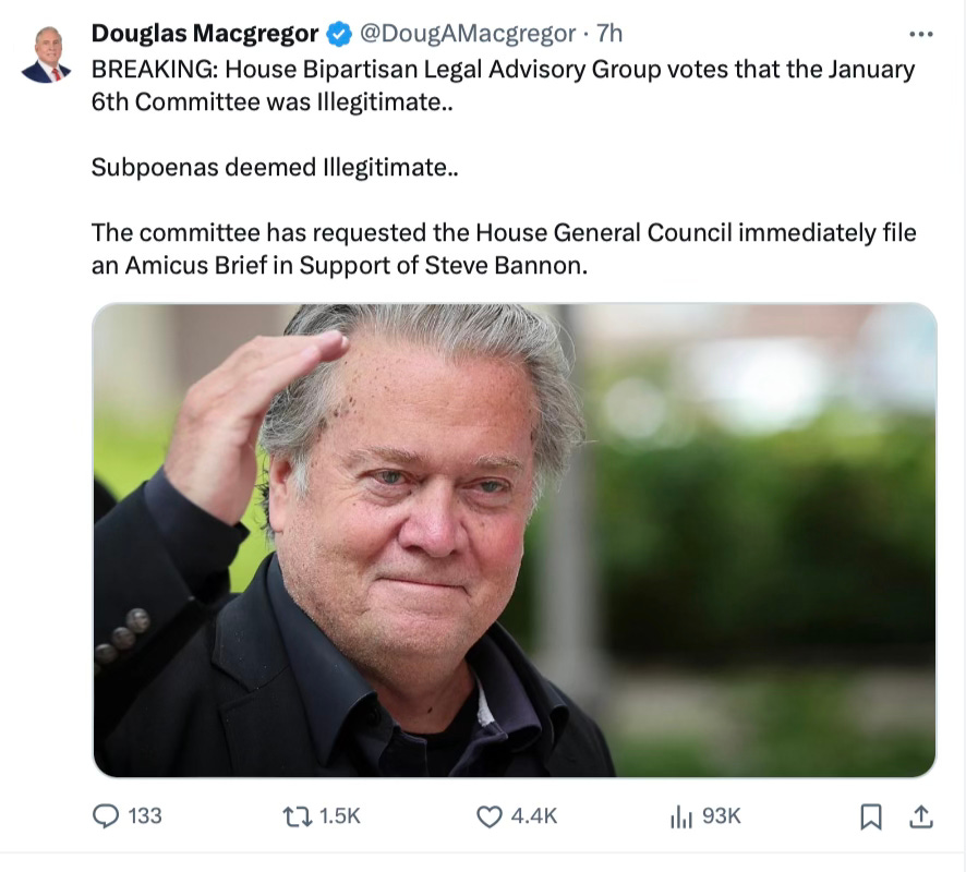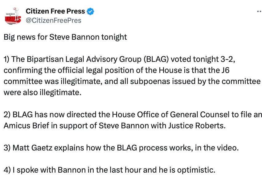 BLAG, the Bipartisan Legal Advisory Group, voted that the January 6th phony baloney committee was not a real group, and thus, the subpoenas are unlawful. The House will now file an Amicus Brief in support of Bannon.