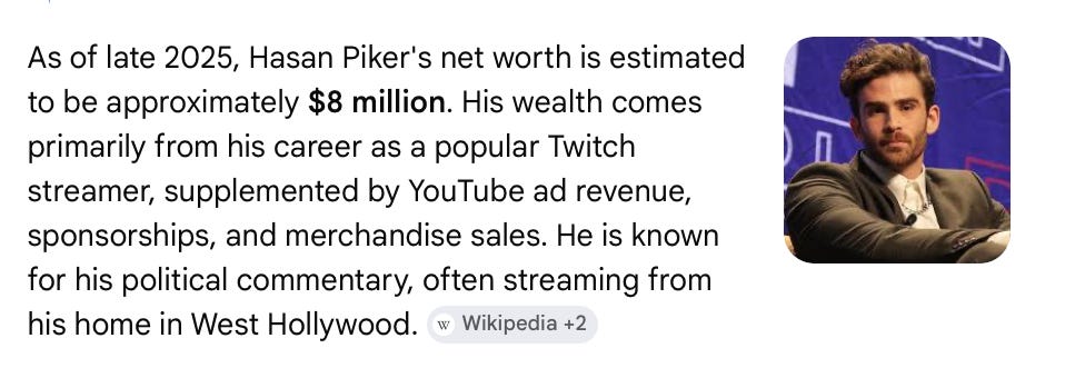 Hasan Piker is The Rich, whether he wants to admit it or not. He’s one of the many socialist socialites who feel comfortable screaming about billionaires this, billionaires that, all the while being on the side with all of the money and all of the power. They’ve adopted the religion of Wokeism to justify it. They borrow oppression.