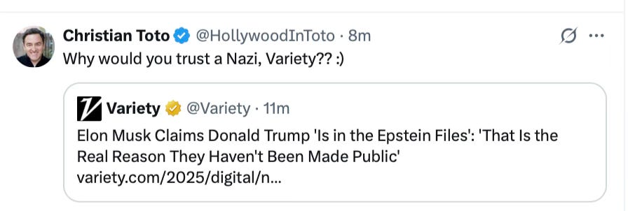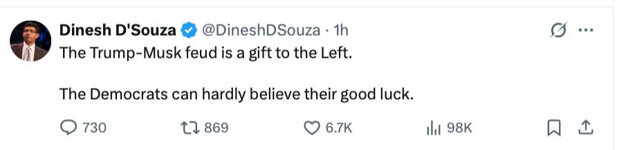 Anyway, I have better things to do than watch Chuck Schumer and the Lincoln Project celebrate the demise of Trump and Musk. So I will probably try to stay off of X. Or at least try and fail.