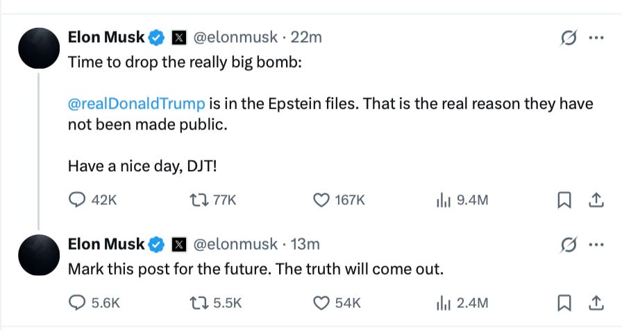 I was driving down the highway when the news of Elon Musk’s adolescent hissy fit hit X. It started with his first hissy fit about the “Big Beautiful Bill.” Elon called it an “abomination.”