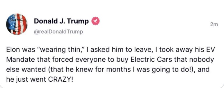 Look, we knew this was coming. It always felt a bit precarious, that relationship between them, watching Elon in the red hat hanging out with Trump like they were best buds or father and son. Trump isn’t that guy, and it was obvious that, at some point, there would be trouble.