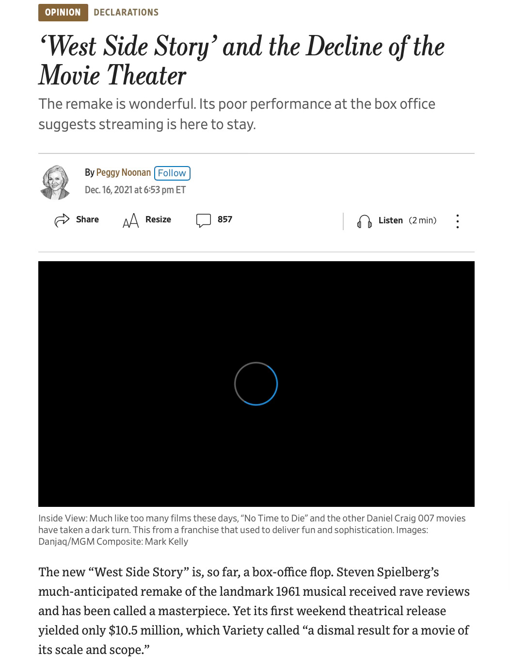 The following year, Peggy Noonan declared movies were over. Audiences weren’t returning because they failed to turn out for Steven Spielberg’s musical West Side Story. Inside the bubble, it seemed like such a big deal. How could it not make money? But it flopped. Hard. To date, it’s only made $38 million.