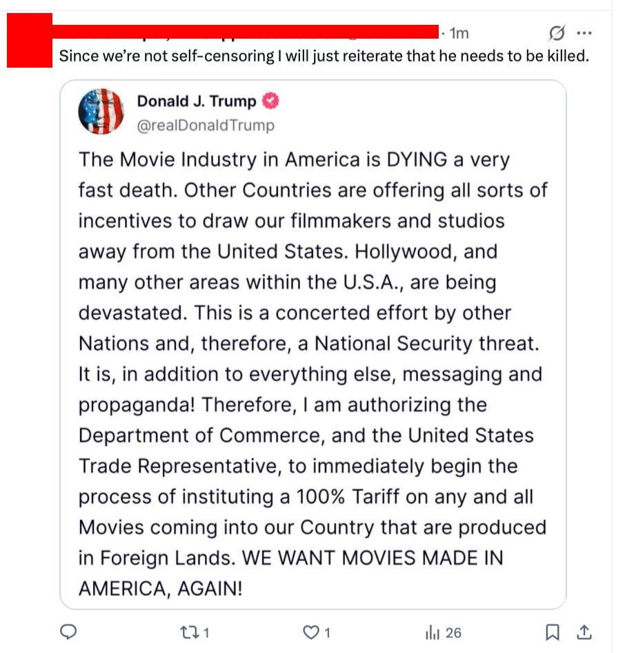 I won’t pretend to know exactly how Trump’s plan to impose 100% tariffs on movies made in other countries will work. But one thing I do know: it won’t matter whether it’s good for Hollywood or not. Their politics will demand they oppose it because of Trump.