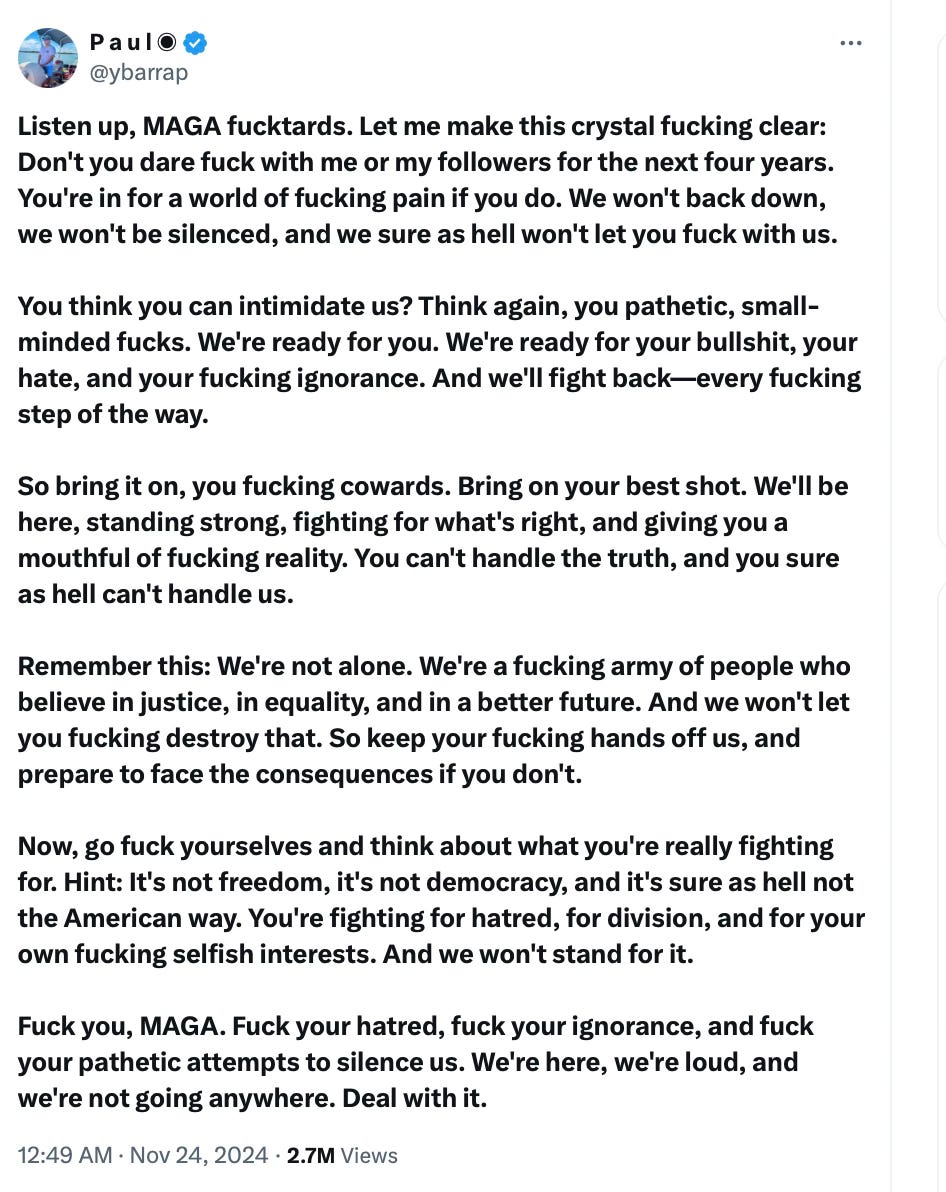 But if they’re honest with themselves, really honest, they will have to face the truth. Sure, they abandoned the working class. Joe Biden got out of the race too late for them to mount a proper campaign. Kamala Harris was a terrible candidate (I threw that last one in there, though it’s a truth they have yet to accept or admit). Elon Musk rigged the election (yes, they are saying that).