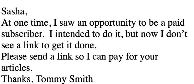 Sasha, every other Substack column that I have seen has multiple subscribe buttons in every post. Many have Kofi links at the end of each article. I don’t mind. Alex Barenson makes a relevant joke every time.
