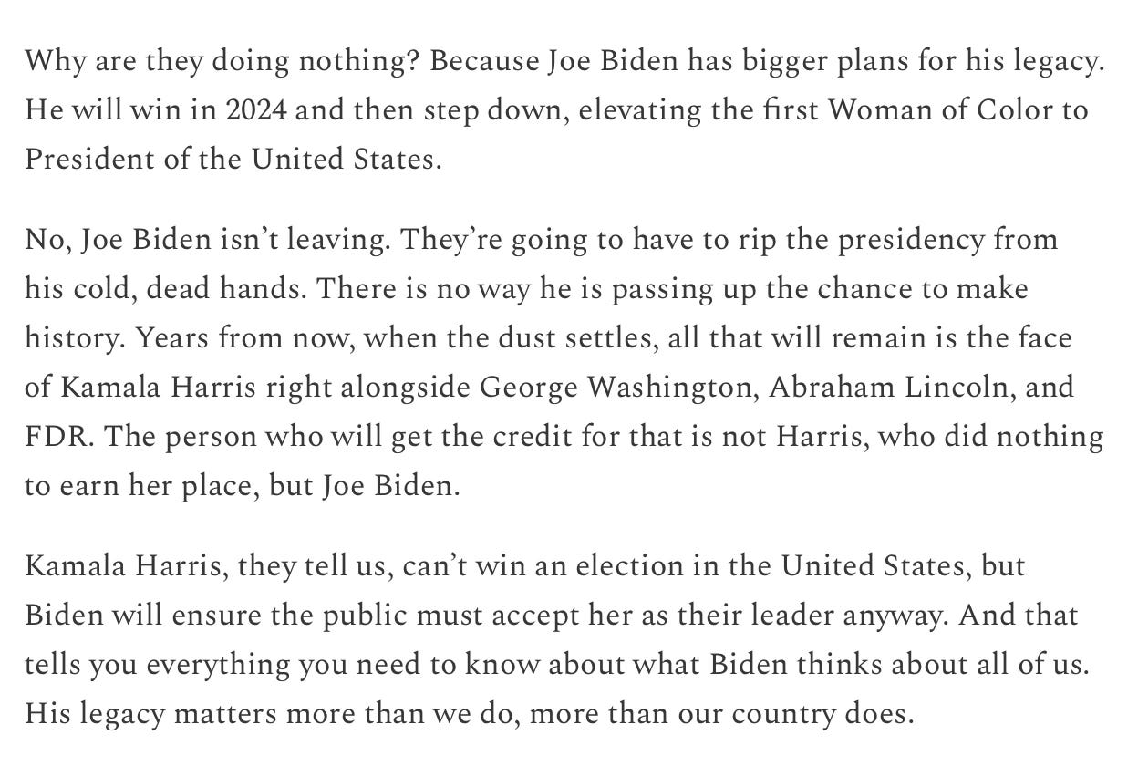 If Biden was hiding it, why would he? Because I think he was chasing his legacy, to be someone important. He was credited with “saving democracy” in 2020 but wanted more. He figured he could win again in 2024 and then step aside to make history with Kamala Harris. That’s my guess, and it was back in February of 2024 when I wrote this:
