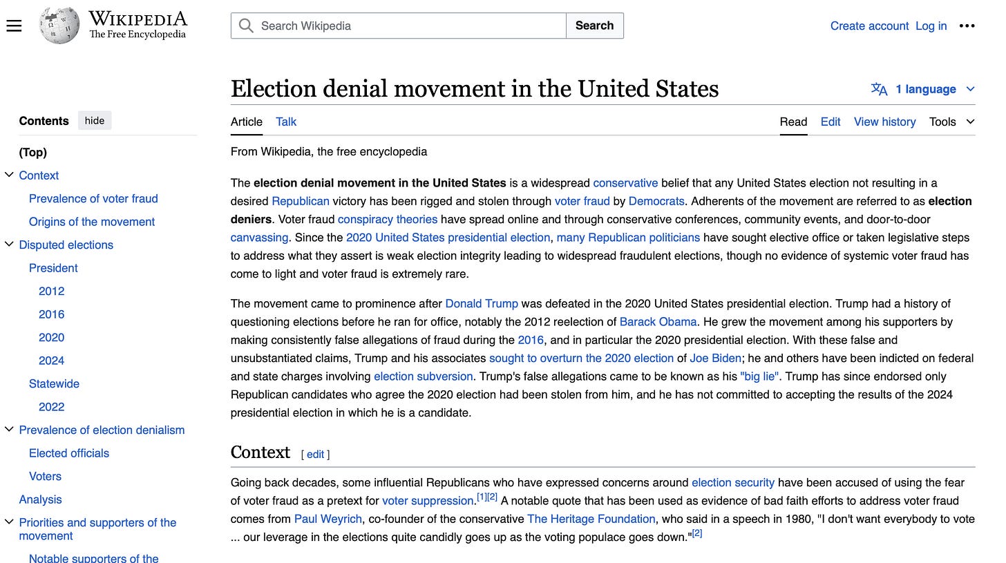 Wikipedia, hilariously, yet another tool of propaganda for the establishment, even has a page for the “Election denial movement”: