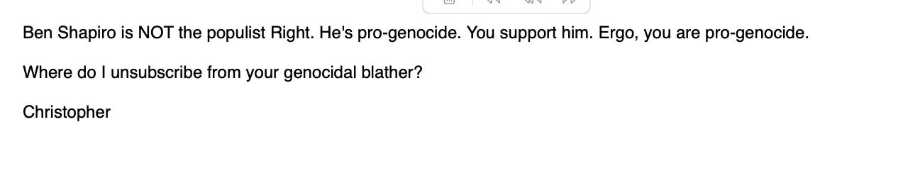 Ben Shapiro’s genocidal? Wonder what source he has for that? I’m here, paid subscriber, and plan to stay. In my ninety third year I’ve enjoyed longer life than most. Maybe got those extra years to read about Sarah Stone’s interesting life and evolution.