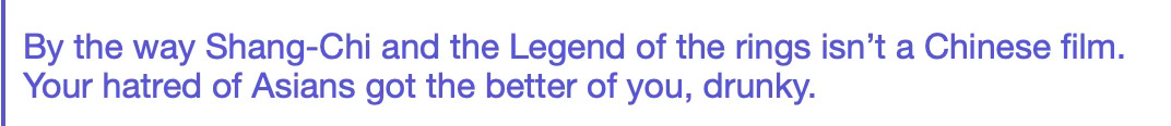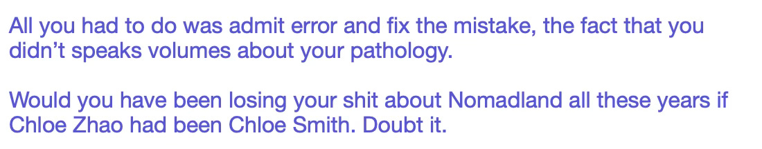 So in this person’s mind, I am so twisted up inside with hatred of Asians I would fume about a movie that won Best Picture because it was directed by a Chinese woman. No kidding. That is what many of them believe.