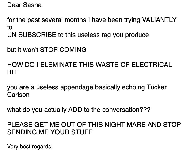 I have so many kind people here, so I don’t mean to point out just this one terrible email. I’m only posting it to say, if anyone is unhappy with the subscription, can’t get out of it, or regret becoming a paid subscriber, you can just send me an email and I will remove you, refund you, whatever you’d like. Deal?