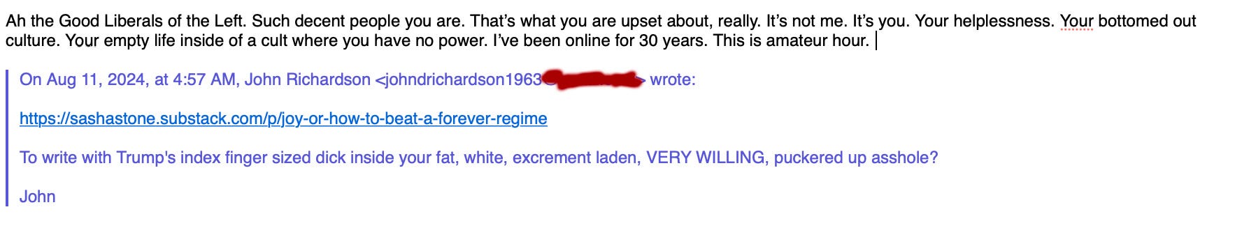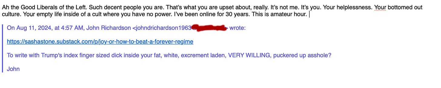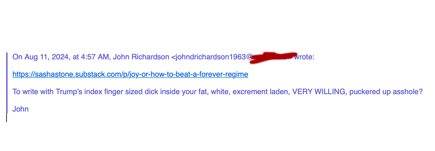 I don’t get as much hate mail as I used to get. When you cross the Trump line, you are not worthy even of even that. You just feel the stone-cold shunning —they’re talking about you but not to you. Most of them. Not all. My most recent column inspired a one John D. Richardson to send me an email.