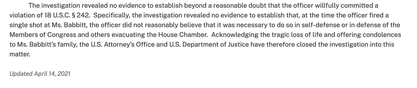 When Ashli Babbitt was shot point blank in the Capitol, a tiny, unarmed woman, it didn’t even matter. Her life was treated like she was nothing. She wasn’t even worthy of acknowledgment by our government. She was treated as a terrorist.
