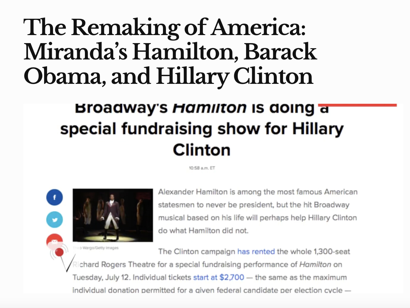 I didn’t notice back then that the Clinton campaign rented the entire Richard Rogers theater as a fundraiser. Tickets start at $2,700 a pop. I would never have thought twice about it. We were on the right side. It was an “all-of-society” effort to stop Trump. We were the good guys fighting the good fight, so why wouldn’t Hamilton be used that way?