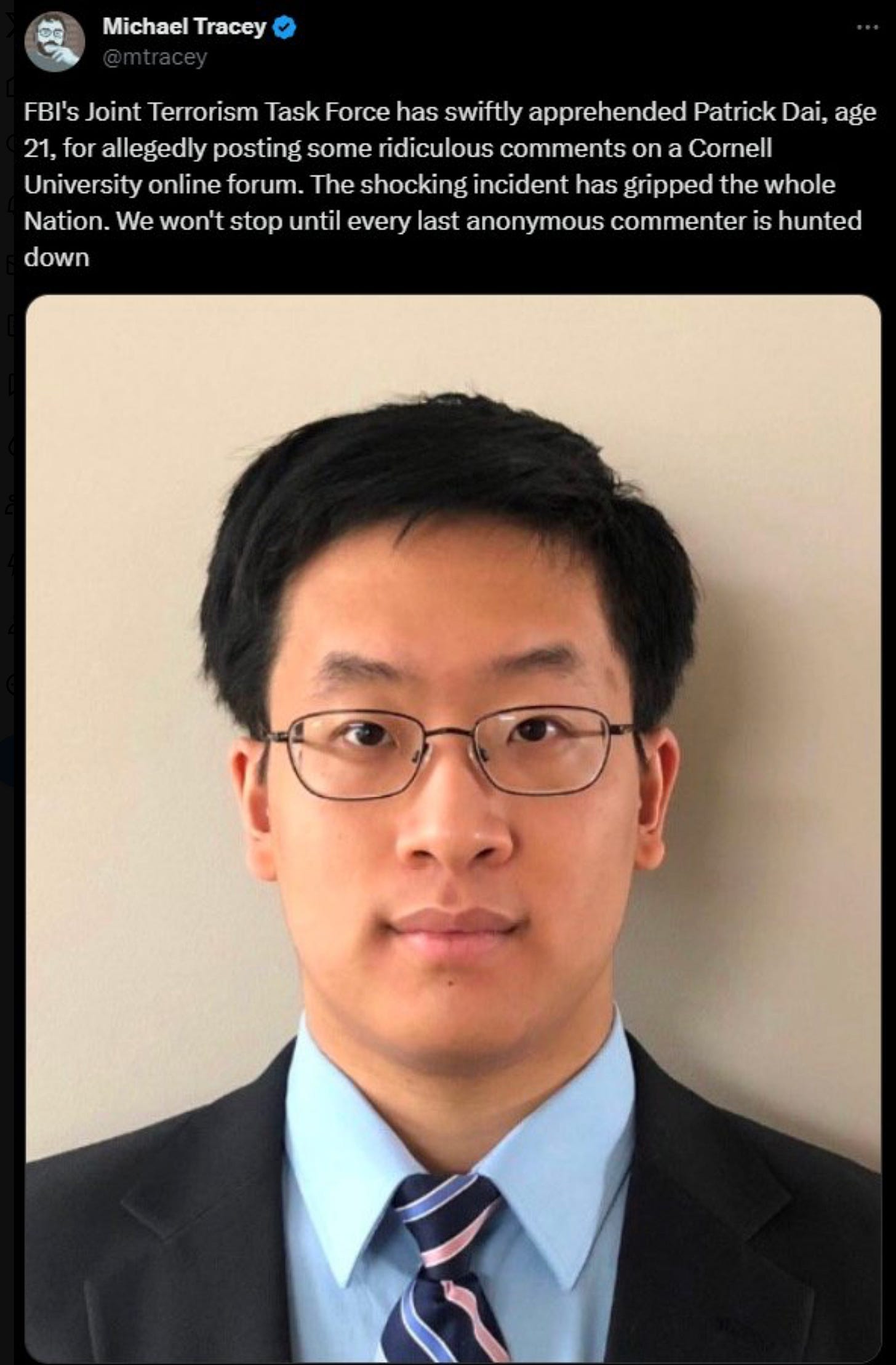 Michael Tracey flaunts casual disregard for what appear to be credible death threats, which are not protected speech under the First Amendment: