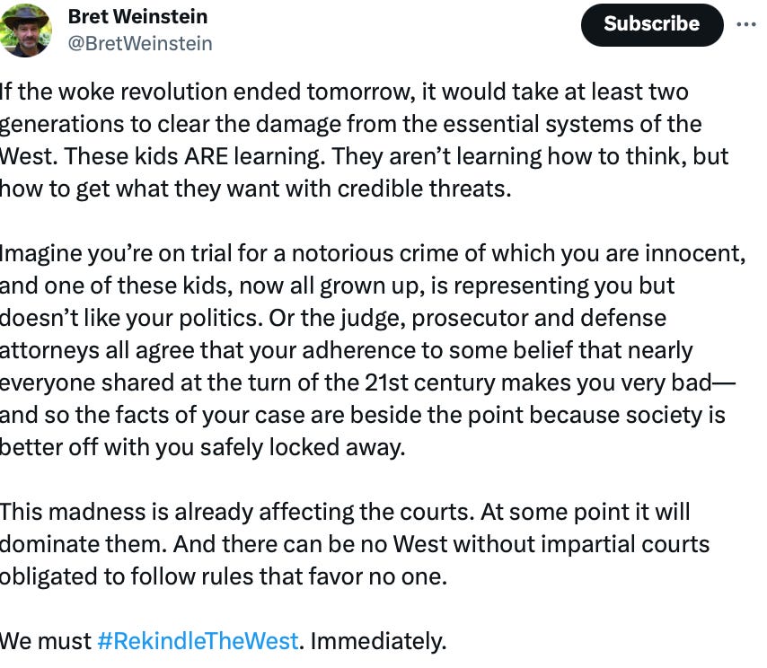 “Whiteness” now meant you were guilty of racism without any way to defend or prove it. When angry mobs gather outside courthouses and threaten violence, we lose the very fabric that holds this country together. As Bret Weinstein, the professor persecuted at Evergreen, says: