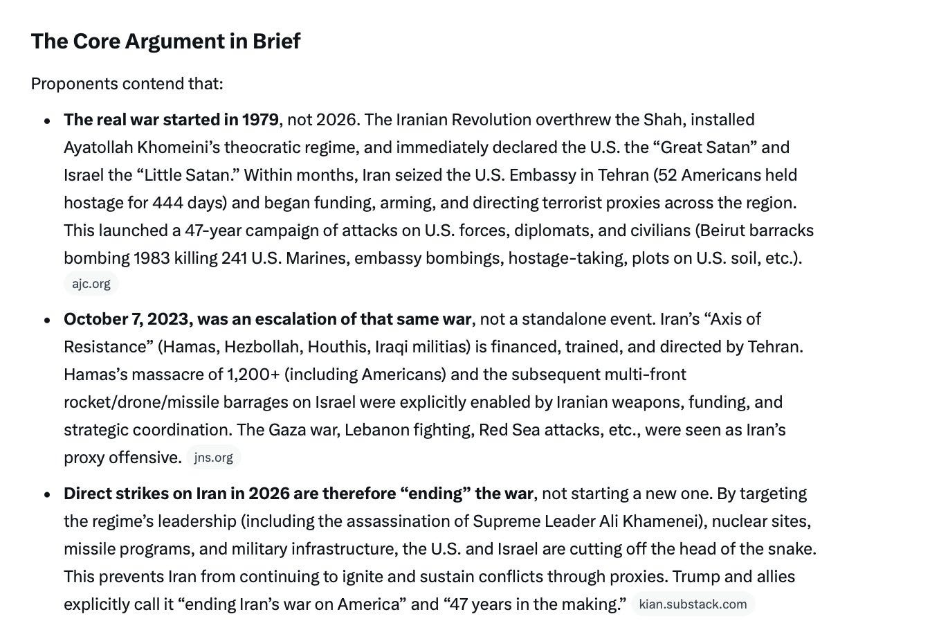 I've been following your posts for a couple of months now and have mostly agreed with everything you have written, However the day Trump announced we were going to war I was shocked. I voted for him 3 times. Now I view him is a liar and a sociopath and a tool of Israel. Our forces are in effect mercenaries for Israel and that is a shame…You might also do some research on how genocidal Israel has become and the Zionist concept of an expanded Israel. Look at the bombing of southern Lebanon as a recent example. They have become what they accuse others of doing - They are the terrorists now.