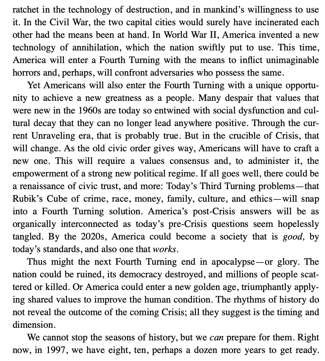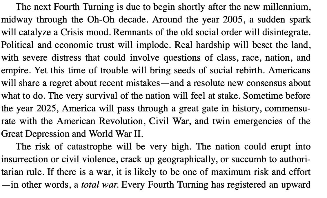 If the Democrats had won, we’d likely have been at war with Russia. Now, who knows where this goes. But a Fourth Turning is not for the faint of heart. Here is how they wrote about it in the 1997 book by Neil Howe and William H. Strauss: