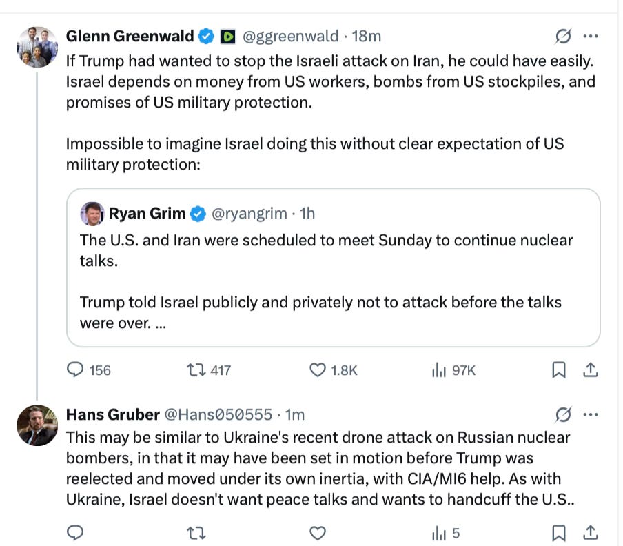 There was no more time to wait.... diplomacy was given every opportunity. America has been supporting Israel with weapons shipments, especially those enormous bunker buster bombs that are successive strikes in the same place, like a drill hammer. I am sure there was also satellite support and logistics. The USA already had moved several B2 stealth bomber to the base in the Indian Ocean at Diego Garcia should Iran be foolish enough to strike at USA bases. It is possible those bombers have nuke warheads on board. Israel has prepared for this day for over 10 years, ever since Barack Obama dithered and appeased, by shipping truckloads of money and gold bars to the Iranian regime, which they then used to arm their militias surrounding Israel. Much of the Iranian leadership was decapitated. There will be a response. We hope they do not already have a nuke they have been hiding