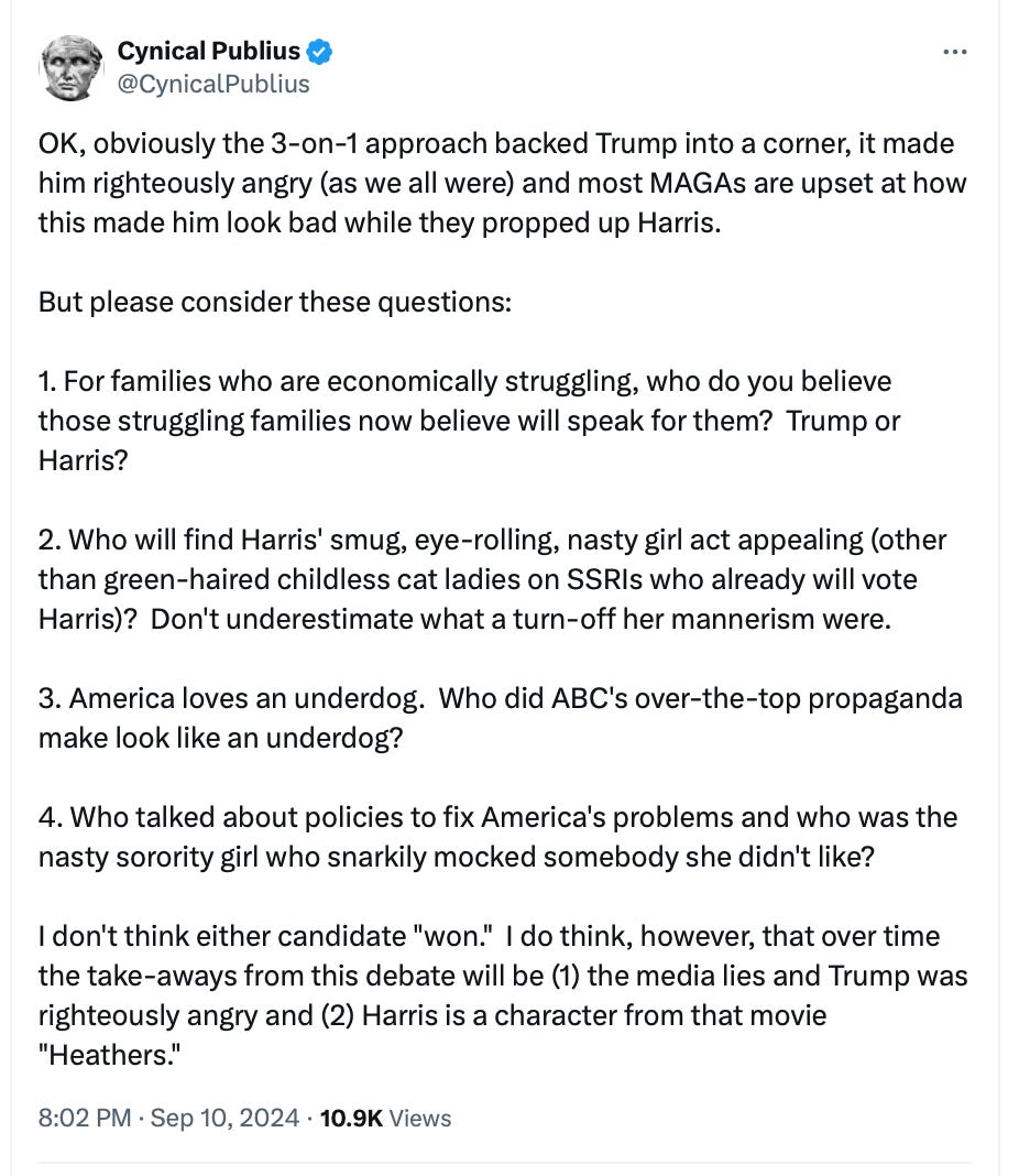 In sum, the debate was like sitting in my mom’s living room and being forced to watch MSNBC. I’m glad it’s over. I can’t wait for the election to be over. Even if Harris wins the election, the Democrats are still stuck with her as their president, and she will be a terrible president. Their empire is still collapsing. There is nothing they can do, no election they can win that can fix that. All they can do is kick the can down the road.