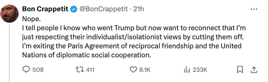 A Trump win makes them all believe that they have, in one election, lost all of their power. That’s why you see so many Instagram posts about suicide hotlines but only for LGBTQIA or Queer women, or BIPOC. No white woman or man will get any sympathy for daring to use the moment to suggest they are in worse pain.