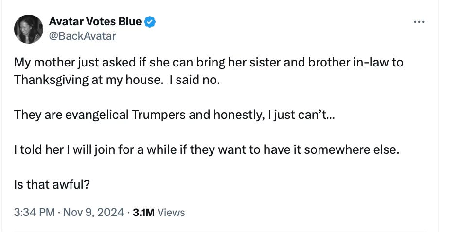 Imagine a Thanksgiving with this level of hatred among the most privileged and lucky people in the world.