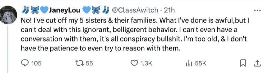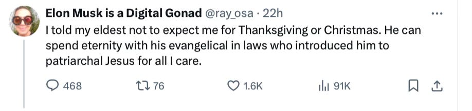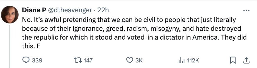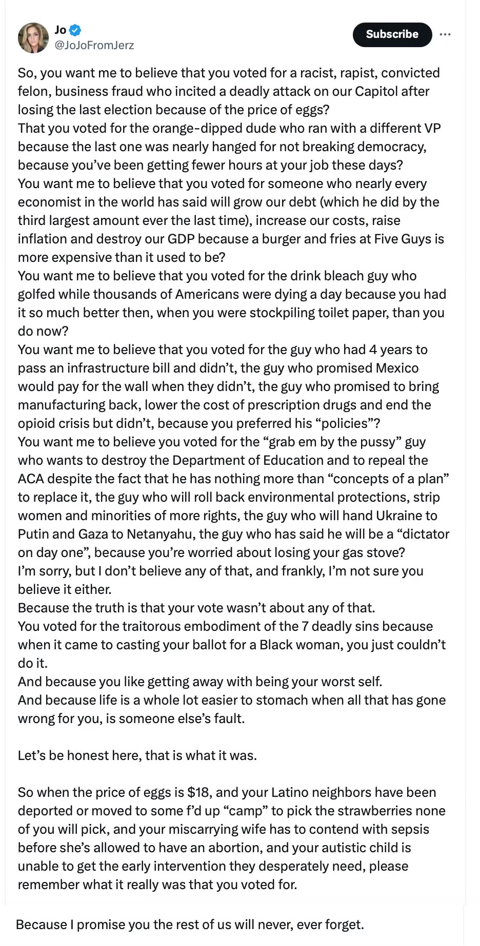 Meanwhile, a wellness check is needed on Jojo from Jerz, another who was so certain her daily rages on X, which earned her so many likes, represented, in any way, the majority in America: