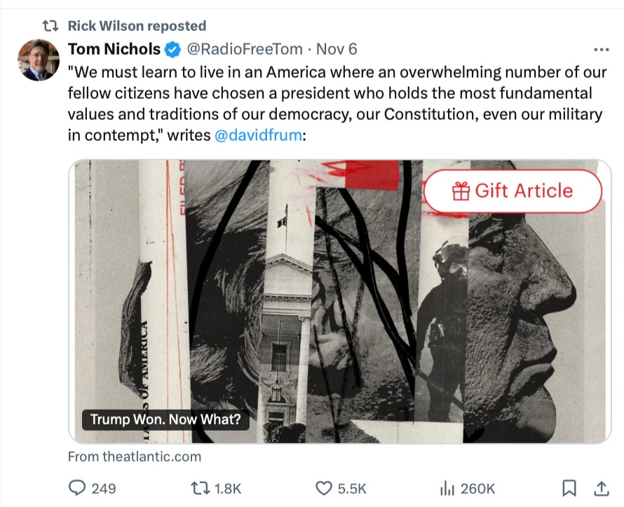 How could the disconnect from reality be that profound? And when he was thoroughly and completely humiliated, along with all the other Never Trumpers, he blamed the voters. He blamed America.