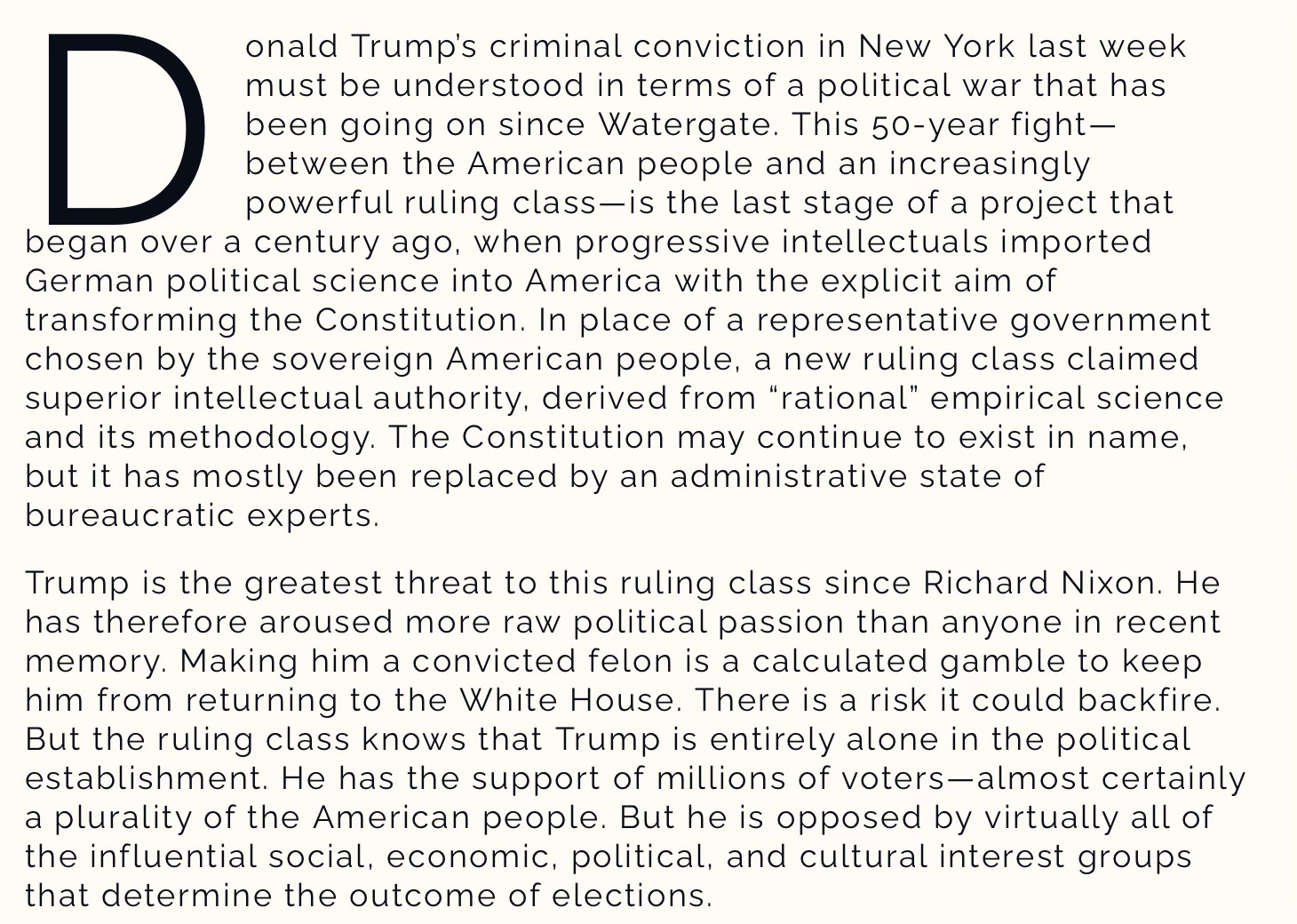 The whole process stinks of desperation. If the progressive elites who run the Biden administration felt confident they could defeat Trump at the polls, we would hear Homeric laughter ringing from the White House and its pet organs in the news media. But Biden is terribly unpopular, even among his base. America’s elites fear and mistrust the American voter. They have lost faith in democracy, a system that in 2016 delivered the power of the presidency to the monstrous Trump, and they dream of a rising class of Platonic guardians, people exactly like themselves, with the right pedigree, the right opinions, the right manners, who rule not because they have won an electoral lottery but in perpetuity, as a reward for their superior virtue.