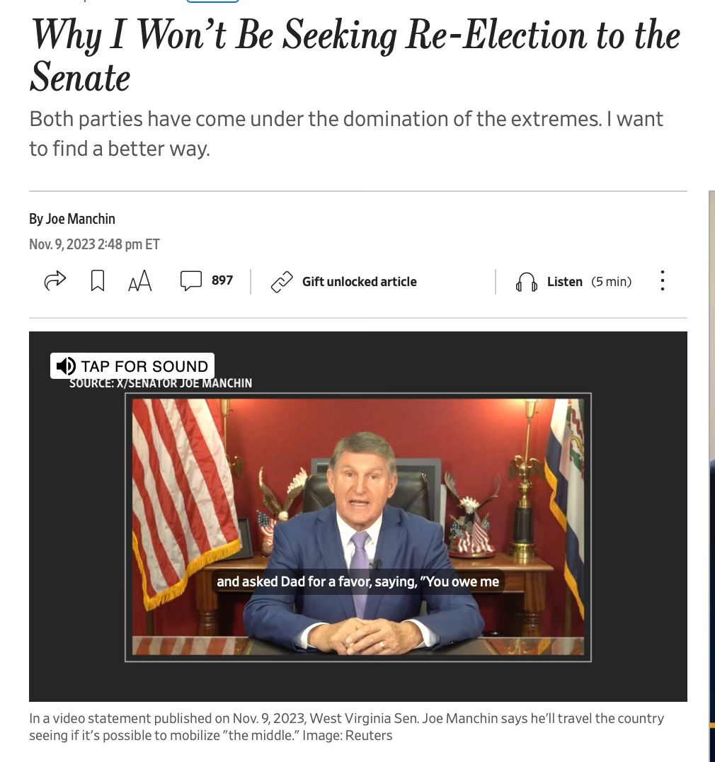 Joe Manchin has announced he’s not going to run for Senate in West Virginia (probably because he would lose) and instead is going to tour the country to see if he can find some “middle ground” for sensible folks. He has written all about the two extremes of each side in today’s Wall Street Journal. It should not be surprising it appears there rather than in, say, the New York Times. Manchin knows media on the Left has become toxic.