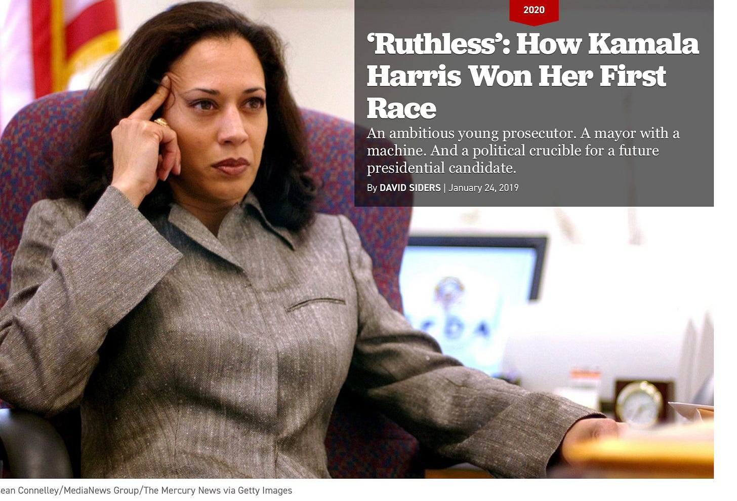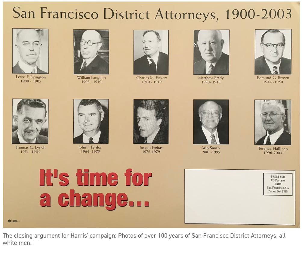 Harris first made history when she became the first woman of color in the DA’s office in San Francisco, where she ran what Politico called a “Ruthless” campaign,” and sent out campaign ads to remind voters of the all-male, all-white history: