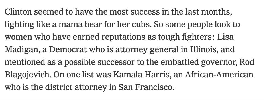 She lost her primary, but she failed upwards as Obama and Biden elevated her to make history for the fourth time as the first woman and woman of color Vice President. It’s so much easier when you don’t have to worry about democracy.