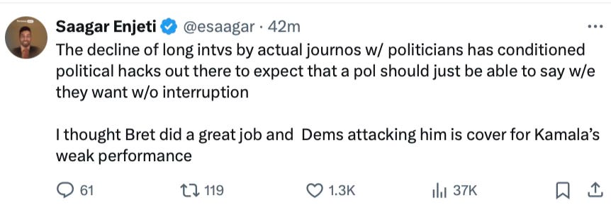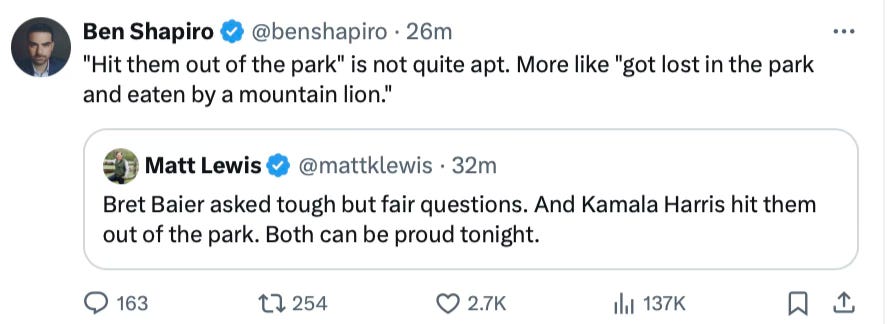 With her temper flaring and her emotions laid bare, Harris seemed more like herself than she has in any interview. She’s never been the nicey nicey “I love the American people,” like she’s catching fireflies - with their DREAMS and their AMBITIONS. At least we didn’t get that version again.