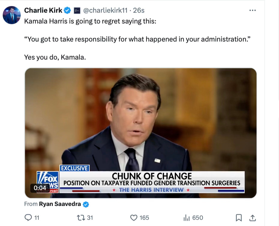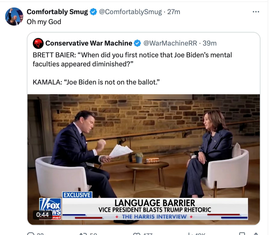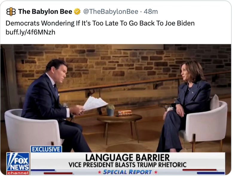 She decided to just keep talking to prevent Baier from asking any questions. He did a great job, considering they arrived late and cut the interview short. Even in that amount of time, it was easy to see that Harris is not prepared to confront the reality of the Biden/Harris administration.