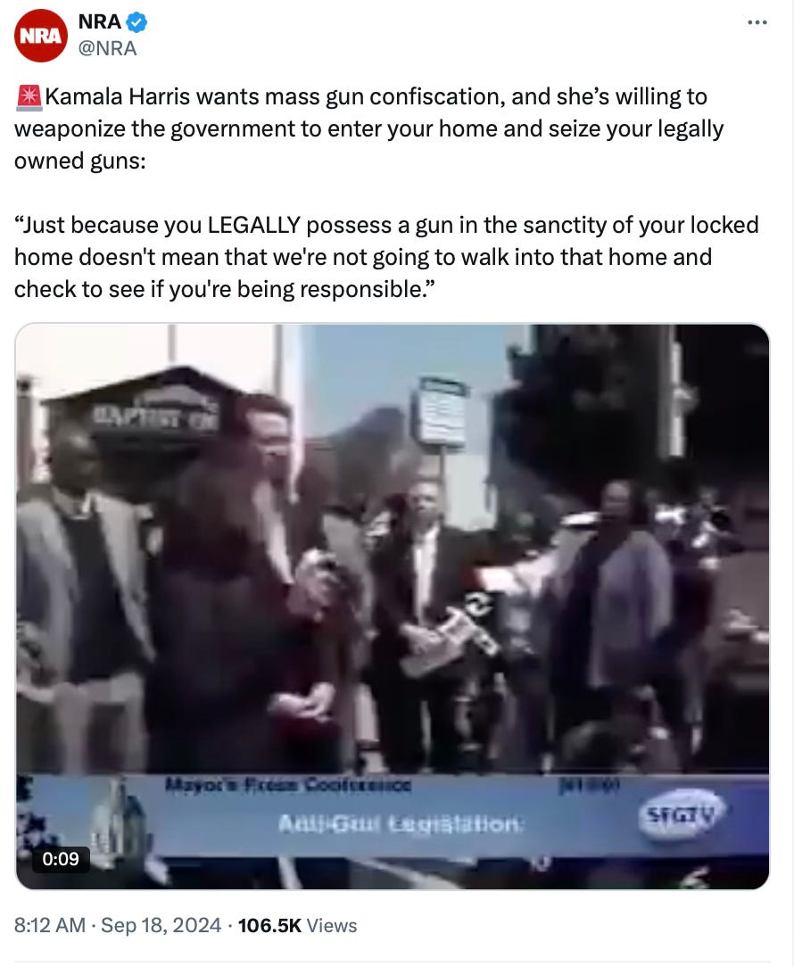 At the same time, the NRA circulated a video of Harris talking about going into locked homes to make sure Americans were in compliance: