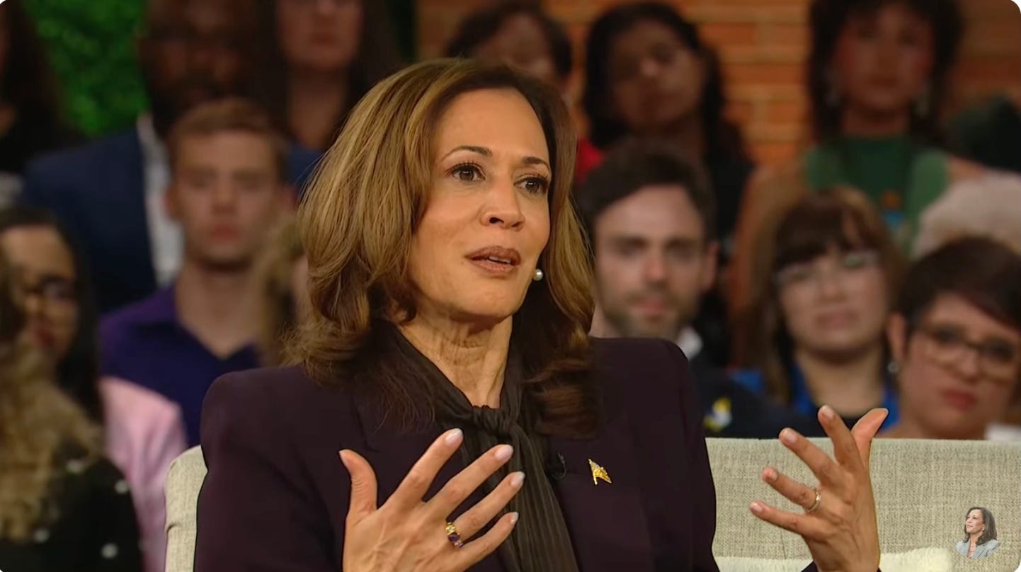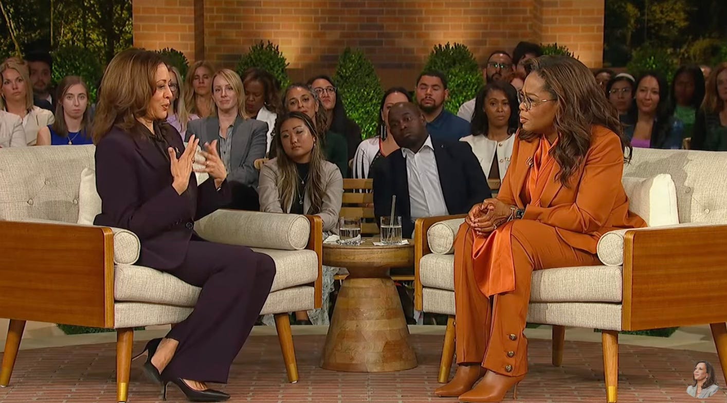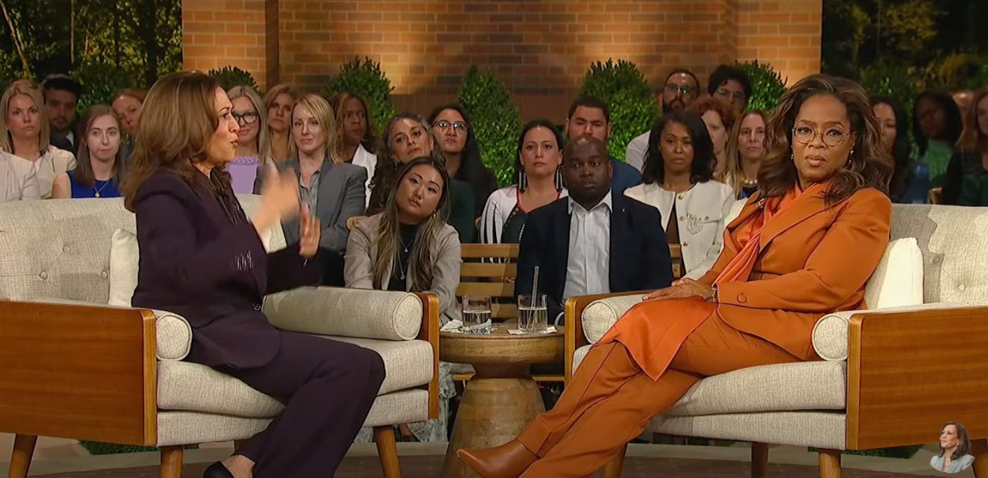 Oprah Winfrey had a townhall style “interview” with Kamala Harris. All of the ruling class were in attendance —Julie Roberts, Meryl Streep, Ben Stiller, Chris Rock, Tracey Ellis Ross — most of whom are afflicted with existential angst as opposed to, you know, practical problems of daily life?