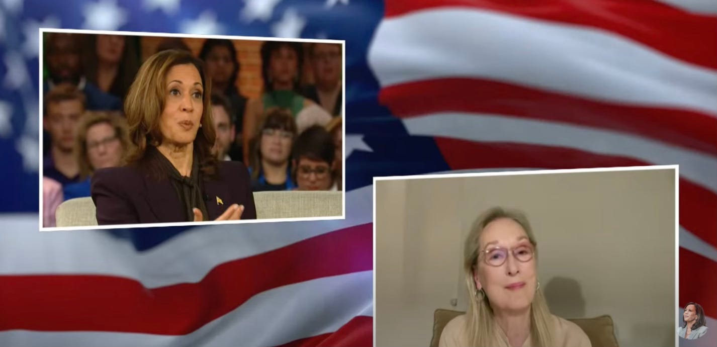 I’m sure an event with Meryl Streep and Julia Roberts was a great way to win over undecided Voters. They’re probably out there thinking, I can’t put food on the table, and I can’t send my kid to school without worrying about them coming home and asking for puberty blockers, and what is going on in Springfield? Are we on the brink of World War III? Ah, but the celebrities will help. They will guide me! Yes! I’ll vote for Harris!
