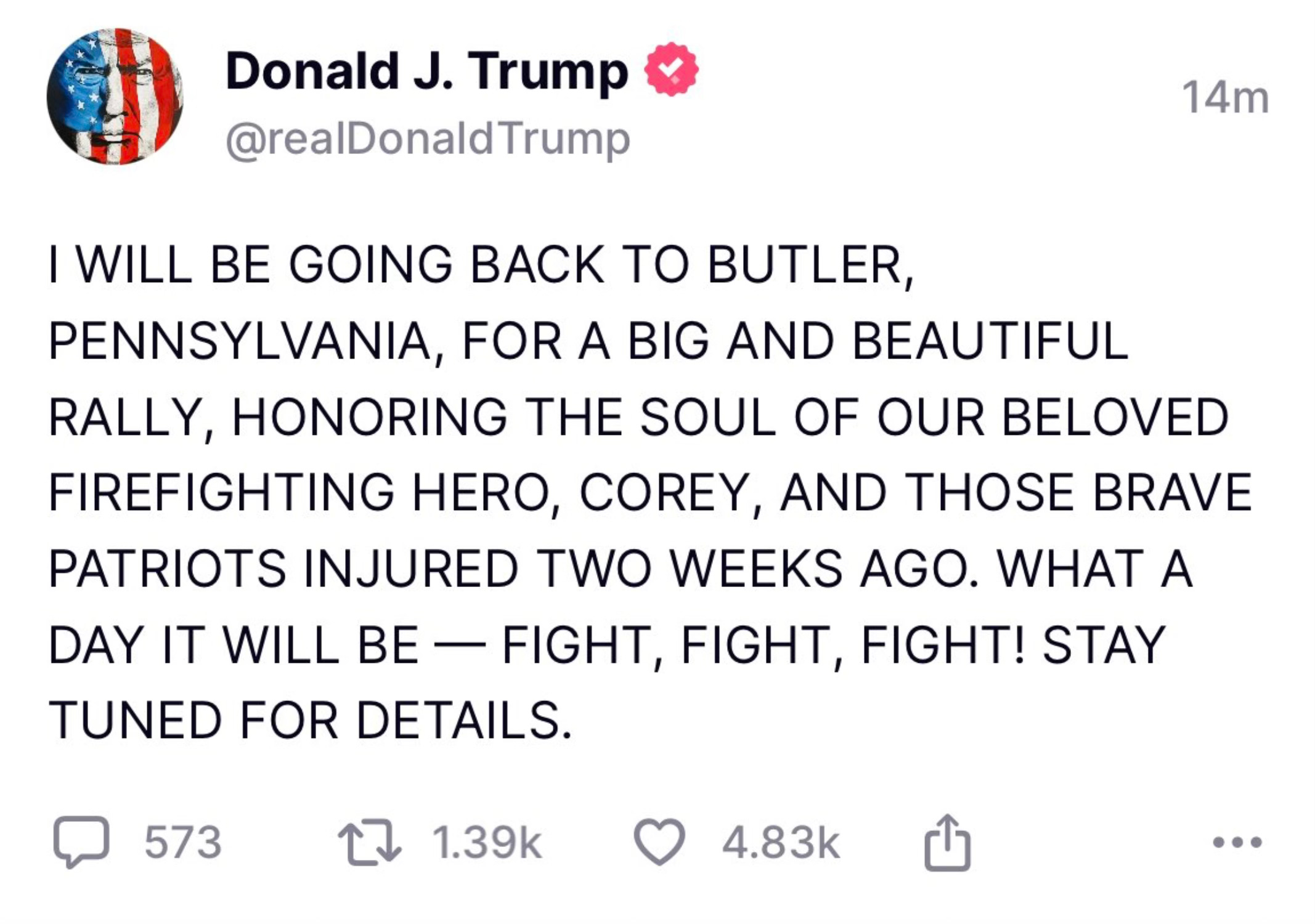 In the other America, Trump is headed back to Butler, PA. What a great thing to do.