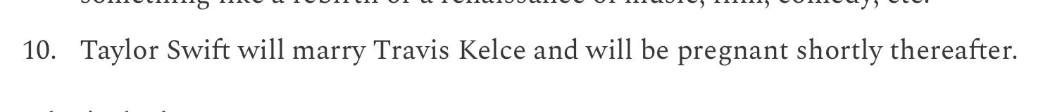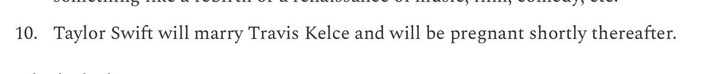 I’ve written about Taylor Swift a few times. Once, out of worry over her stance on transgender ideology and her influence on young girls. And again, about her romance with Travis Kelce one year ago today. I also predicted this in my predictions for 2025:
