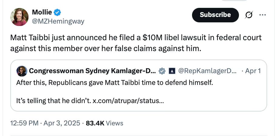 Well, she better lawyer up. Taibbi is suing her for $10 million.