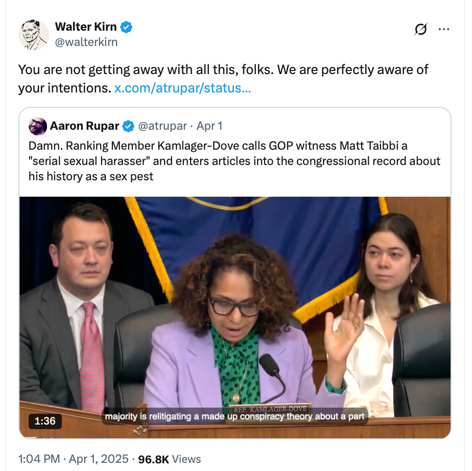 When Matt Taibbi testified before Congress on censorship, Rep Sydney Kamlager-Dove called Taibbi’s testimony an effort “To distract from the dumpster fire this administration is pursuing,” then added that Republicans were “elevating a serial sexual harasser as their star witness.”