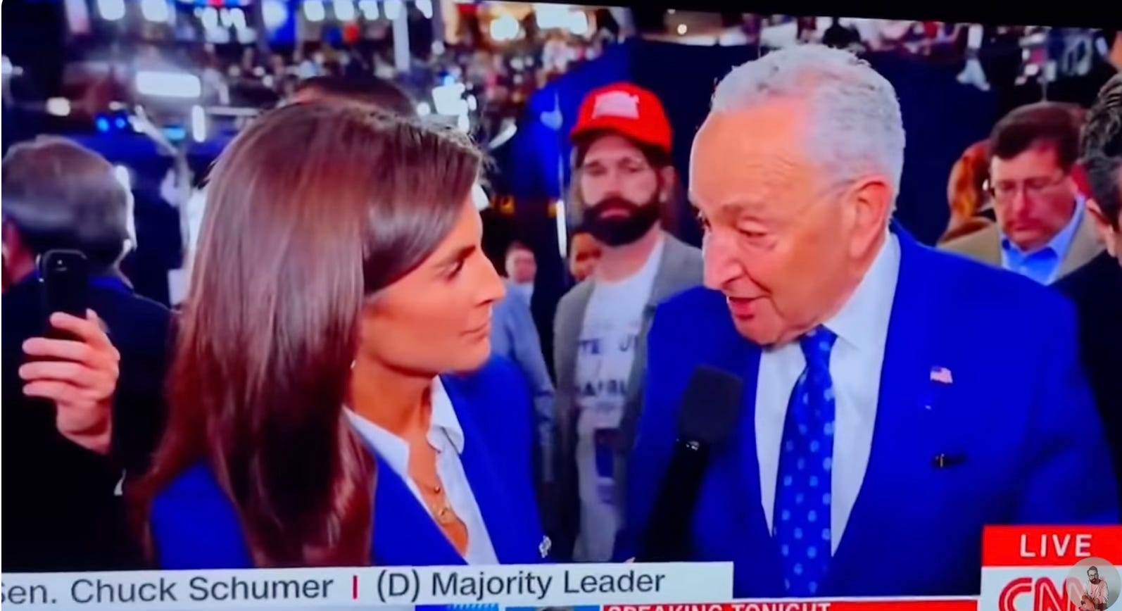 He did find a way back in and wandered around the convention floor, even appearing behind Chuck Schumer as he was interviewed on CNN.