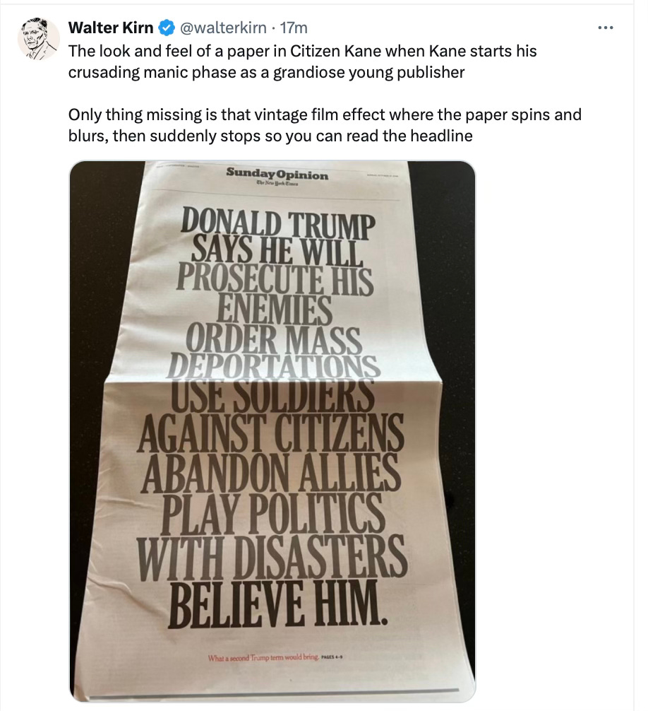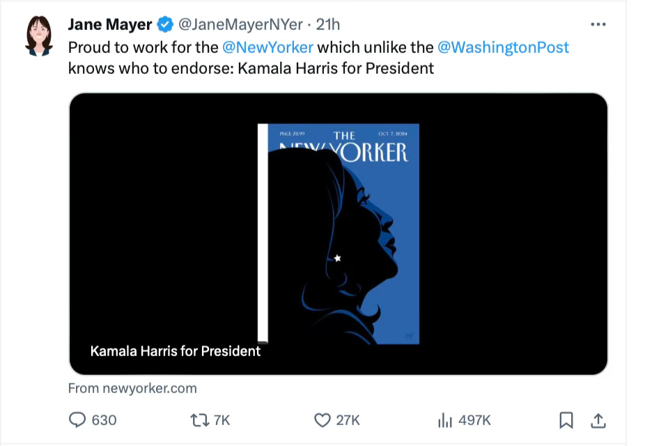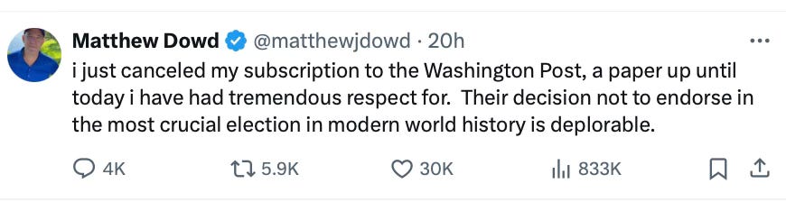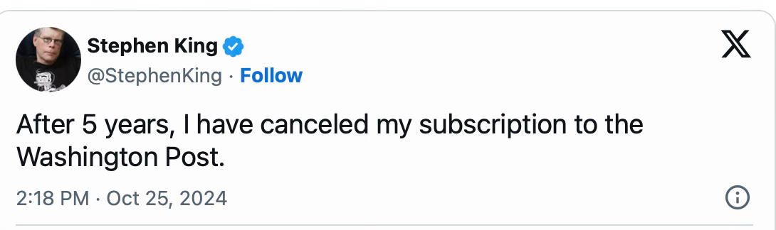 Unlike those fascists gathering in Madison Square Garden, we believe in freedom of opinion and freedom of choice. But if you don’t endorse our candidate, we’ll wage war on your newspaper. We will take screenshots of high-status people like Stephen King attempting to destroy the Washington Post.