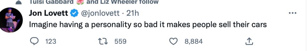 What toddlers they are, celebrating Musk’s businesses taking a hit, as they do everything they can with legacy media doing their bidding in attempting to discredit and destroy what Musk has built for himself. I know it can’t compare to hiding behind an anonymous Twitter account and pulling the lever for brain drugs, but Musk’s accomplishments are many; theirs are few.