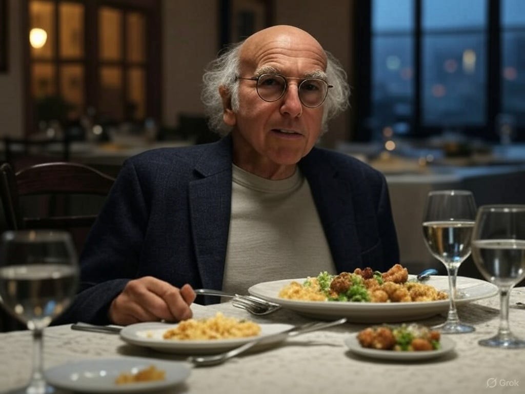 The restaurant falls completely silent. Not a fork is lifted. Not a breath is taken, not a laugh erupts. The publicist stiffens. All eyes are on Larry David, who slowly lifts his head to see who would dare ask him this.